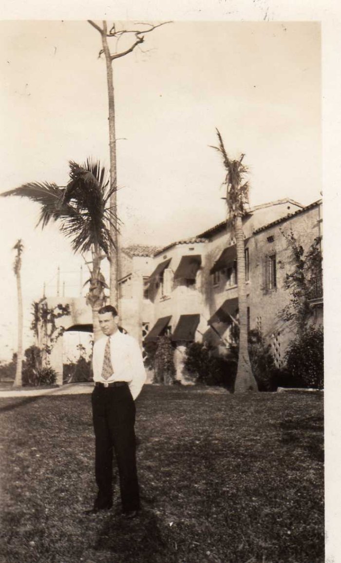 This image is of Sylvester Diebold in front of some damaged trees and a building.