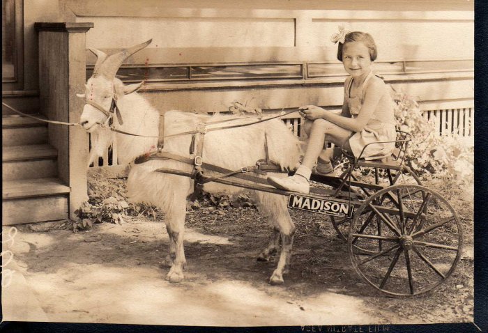 This image is of Mary Alice Diebold with one of the goats that used to circulate Madison.