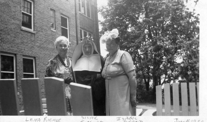 This image is of Lena Riemer, Sister Gorgonia (Diebold- sister of Mathew) and Isabel Diebold taken on June 16, 1950, most probably at Sister Gorgonia's convent in St. Louis.