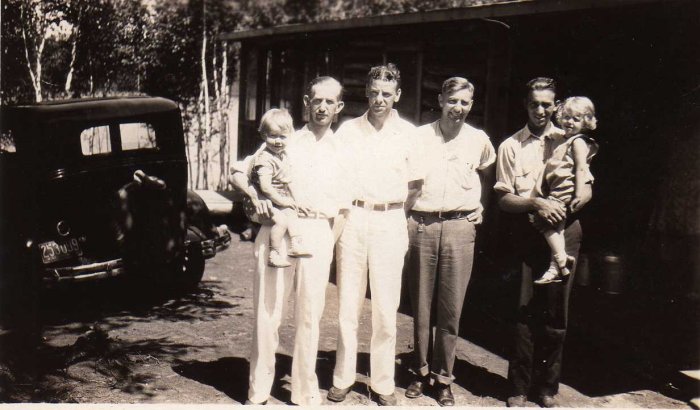 This image is of Dr. Charles Hangar with unknown child, Sylvester Diebold, Scotty Skidmore and 2 unknowns.