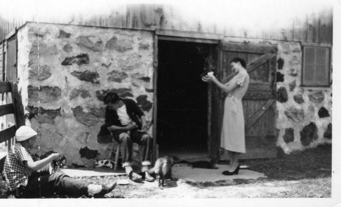 This image is of Bill (center), Mary Alice (right) and an unknown person playing with kittens at the farm.