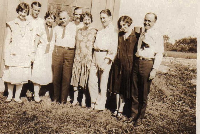 This image is of many unknowns. Two who are known are Sylvester Diebold, second from left and Blanche Tice Diebold, third from left.