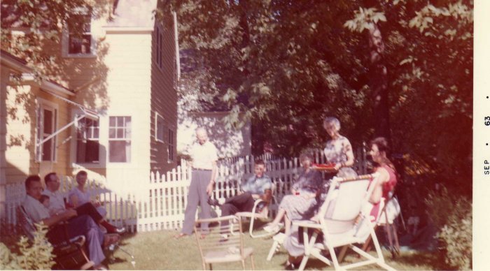 This image is of, from left to right: Ivan Gutzmer, Jeff Diebold, Bob Mayville, Vivian Klebs, Scotty Skidmore standing, Bill Diebold, unknown person, Ferne standing, and Lonnie Diebold wearing the red top. Picture taken in Sept. of 1963.