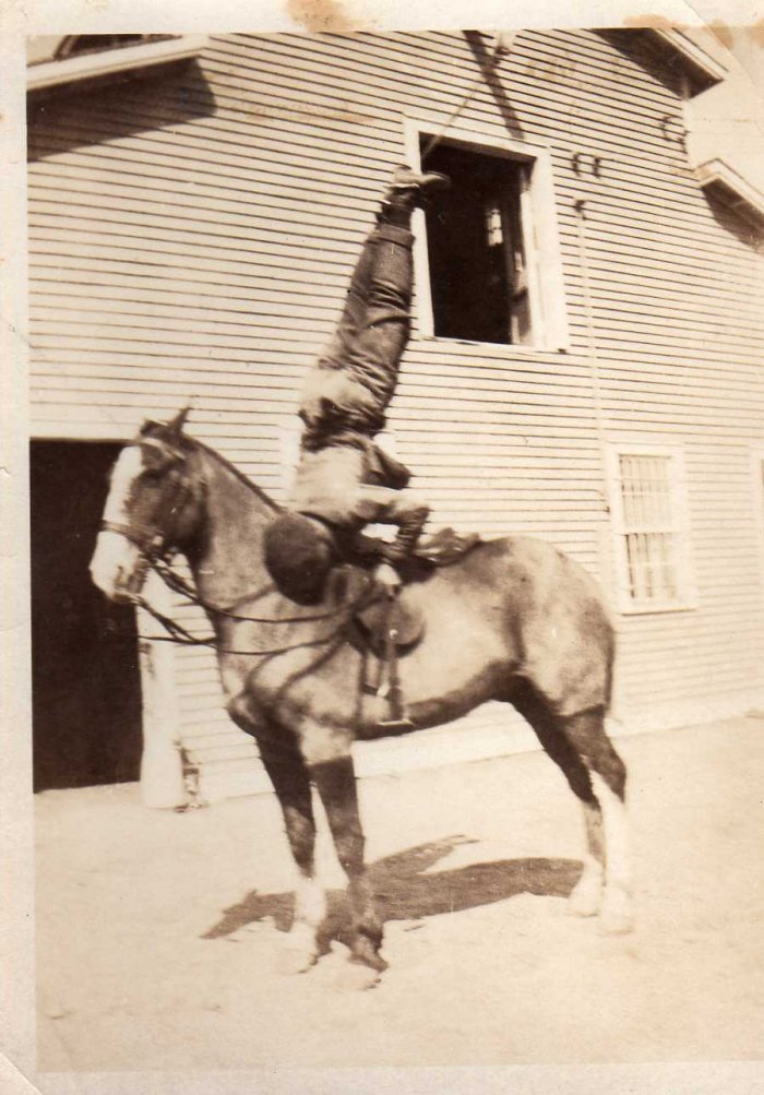 This image is of Sylvester Diebold fooling around on a horse out west during his time in the army.