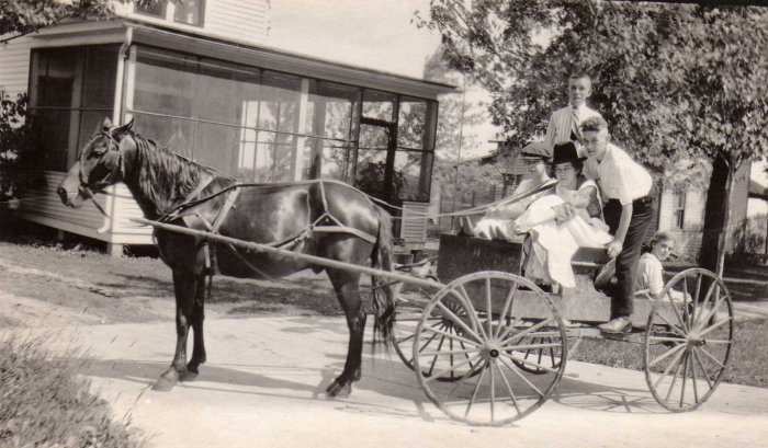 This image is of Eula Mack and Velma Mayville seated, Reynolds Mayville in back, Lafayette Thompson to the side and Olive McEwan seated on the back of the wagon.