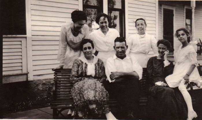 This image is of, standing in back: Pearl Thompson, Gertie Mack, Isabel Greeley Buffum; seated Unknown, Mike Mack, Unknown and Olive McEwan.