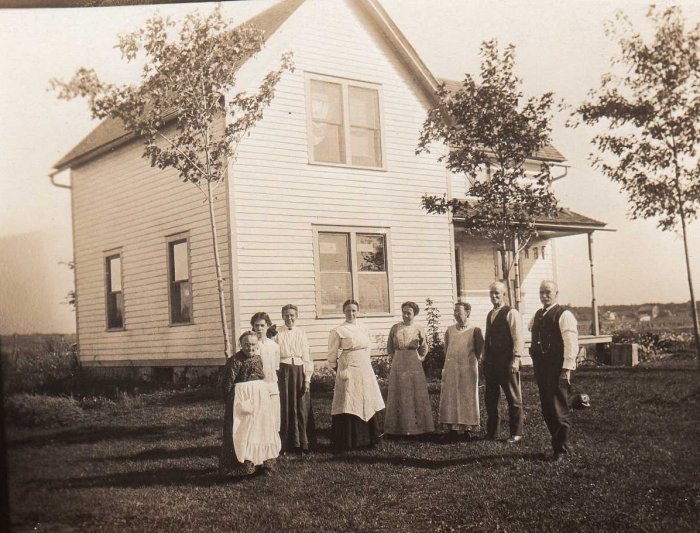 This image is of Ruth Dimmys Tarbell Greeley, Eula Mack, Vernie Shepher, Unknown, Gertie Mack, Isabel and Joe Buffum, and unknown man.