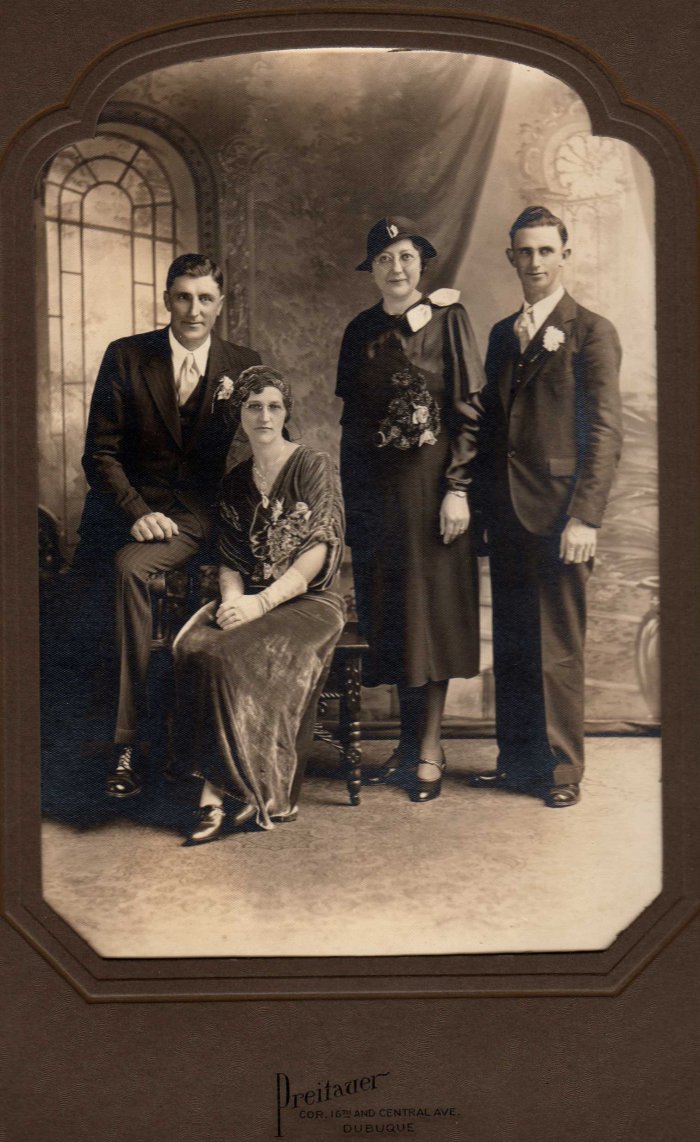 This image is of Bernard Hartung on his marriage to his second wife, Adeline Reuter. Standing on right are their witnesses, Margaret Hartung and Clare Furlong. Article describing the wedding including the clothes worn: Dubuque Telegraph-Herald and Times-Journal, November 22, 1932 "Reuter-Hartung The marriage of Miss Adeline C. Reuter, daughter of Mrs. Anna Reuter, 967 Riker street, to Bernard M. Hartung, Dickeyville, son of Mr. and Mrs. Joseph Hartung, Cuba City, was solemnized in St. Columbkille's church at 7:30 o'clock in them morning. The Rev. J. Halpin, pastor, read the single ring ceremony and nuptial mass. The bride wore a lovely blue panne velvet frock, an ankle length model, fashioned along simple lines. She also wore a hat to match and a corsage of roses and snapdragons. Miss Margaret Hartung, Cuba City, was the bridesmaid. She wore a brown satin crepe frock, hat and shoes to match. Her corsage was made of roses and chrysanthemums. Clair Furlong was the bridegroom's attendant. At ll o'clock, a breakfast was served thirty eight relatives at the Roselip tearoom. The honeymoon is being spent motoring and after Dec. 15 the newlyweds will be at home to their friends on a farm near Dickeyville. Mrs. Hartung is a graduate of the Mercy hospital training school." | |