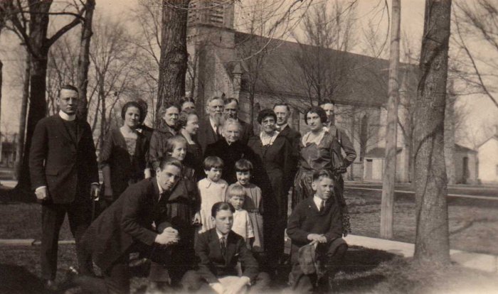 This image is a large gathering of Hursts!! Left to right standing in back row: Father Joe, Rose, Beeza and Ella Hurst with Burt Larkin behind her. Next is James Hurst Sr., Unk man next to James, wife Mary Ann Walsh in front of him. Addy Hurst, unknown behind her, then Katherine and Jim Hurst. In front: kneeling on the left is Bob Larkin and on the right is Ed Larkin. The other children are unknown Hurst cousins. | |