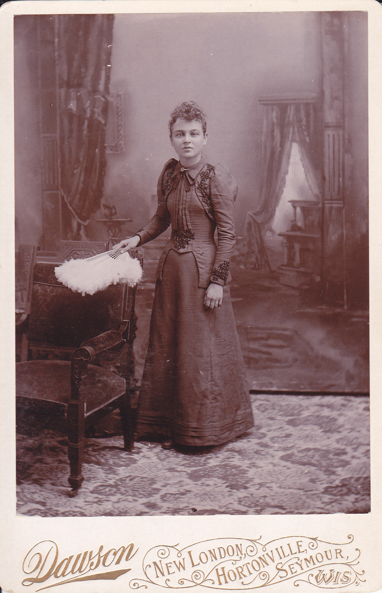 This image is of unknown lady standing and holding a feathery white fan. It was taken by Dawson of New London/Hortonville/Seymour