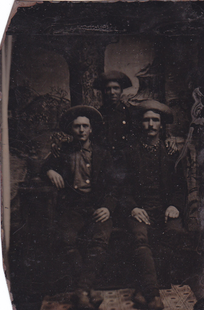 This tintype is an image of three men who may be Mayvilles. The man standing who is darker than the others has distinct Mayville features. Perhaps the man bottom right is a Peep??? These are all guesses as this photo is not identified at all. | |
