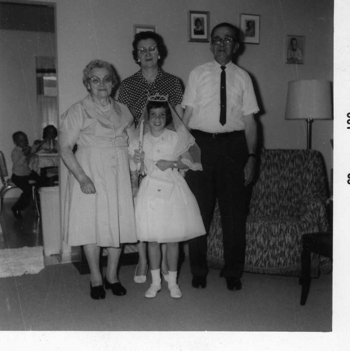 This image is of Michelle Lins in the front Grandma Lins, with Hildegarde Hartung and Reynolds Mayville.