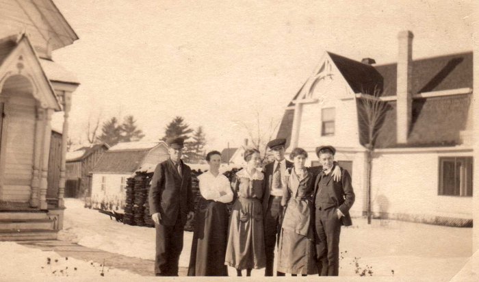 This image is of Collin, Clorie, Sarah, Howard, Velma Mayville and Lafayette Thompson. To their left is the front of the Mayville house on S. Franklin St. in Shawano - it still stands today.