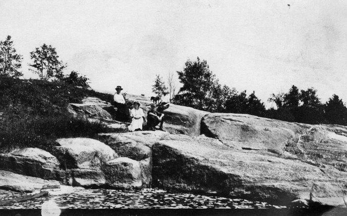 This image is of Clorie, Velma, and Reynolds Mayville with Llewellyn Mack at Keshena Falls.