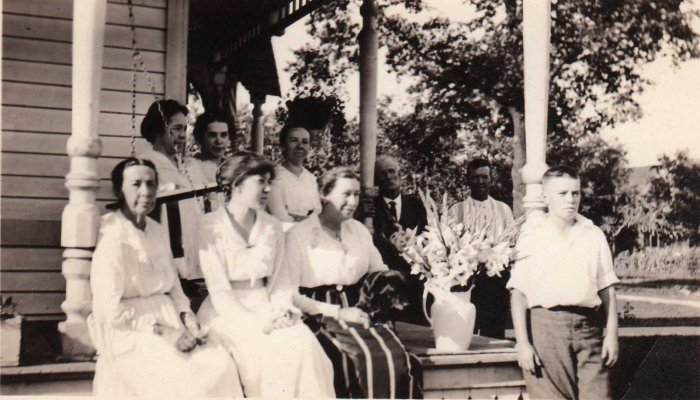 This image is of: seated in front, Isabel Greeley, Velma Mayville & unknown DeLong; seated on the swing, Gertie Mack, Eula Mack and Clorie Greeley Mayville; standing, Joe Buffum, Collin Mayville and Lafayette Thompson. This is on the porch of the Mayville house on S. Franklin St. in Shawano. | |