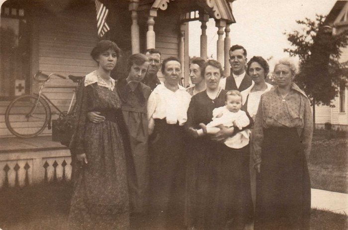 This image is of Velma, unknown, Collin, Clorie, Sarah Jeffers, unknown holding unknown baby, Howard, Melissa Mayville, and unknown. All standing in front of Mayville house on S. Franklin in Shawano.