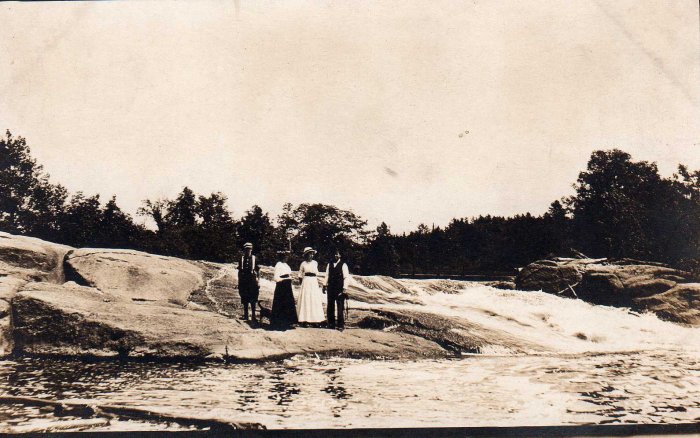This image is of Llewellyn Mack; Clorie, Velma & Collin Mayville at Keshena Falls.