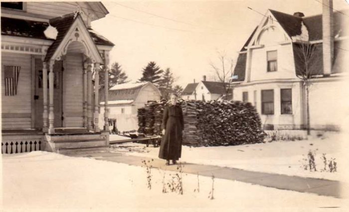 This image is of Loretta Grant Trickie Mayville standing in front of Collin Mayville's house on S. Franklin St. in Shawano.