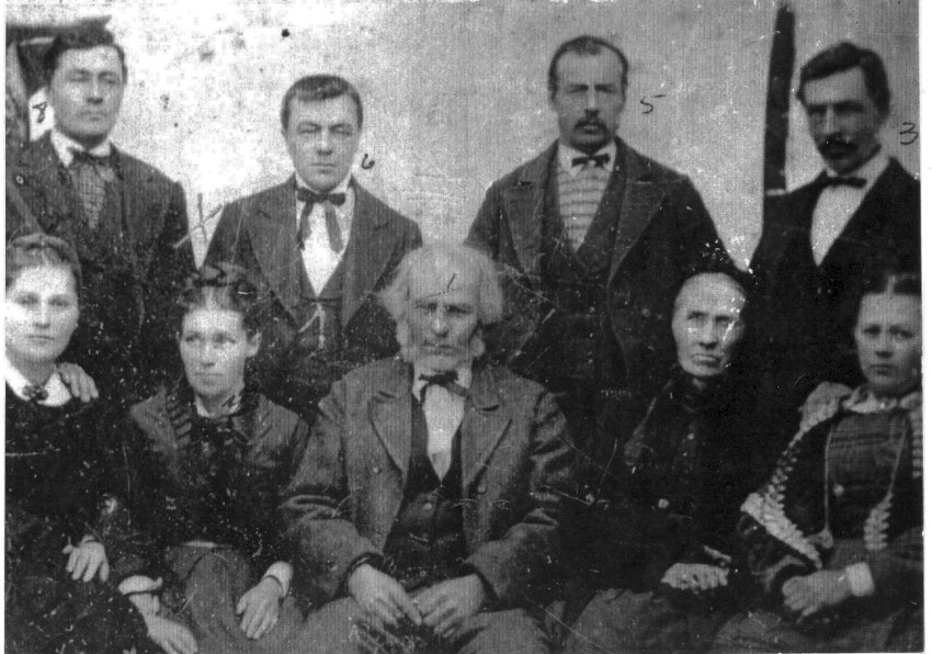 This image is from Carroll Deschaines: "l/r: Georgiana LEBEL, Edwidge LAGACÉ, Jérôme, Marcelline DION, Basilice COUILLARD. Standing: Édouard, Alfred, Joseph CARON, Achille * Courtesy of the artist & author, Fredo DESCHÊNES, formerly from Témiscouata County, now living in Longueuil, QC." | |