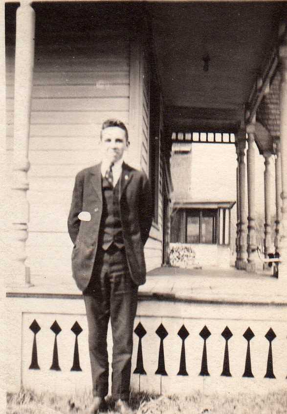 This image is of Reynolds Mayville. Behind him is the Mayville house on S. Franklin in Shawano.
