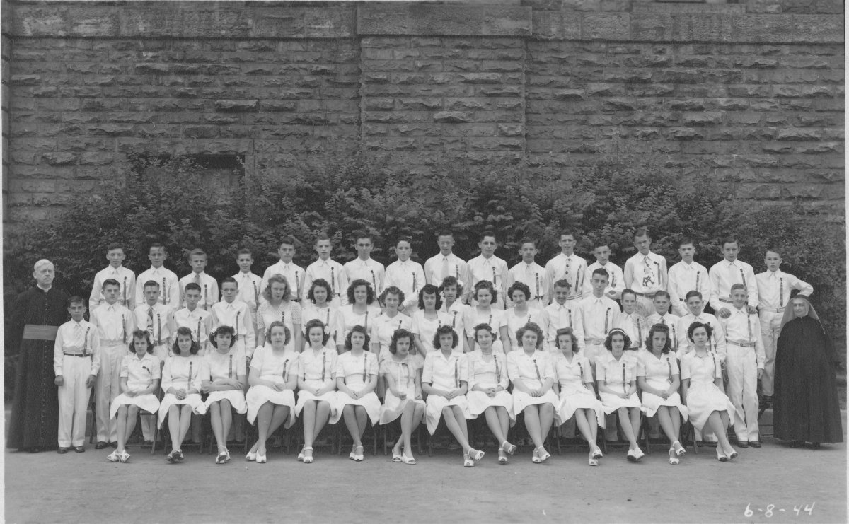 This image is of the 8th grade class of St Raphael's Catholic school in 1944. Robert Mayville Jr. is the fifth little boy from the left in the second row.