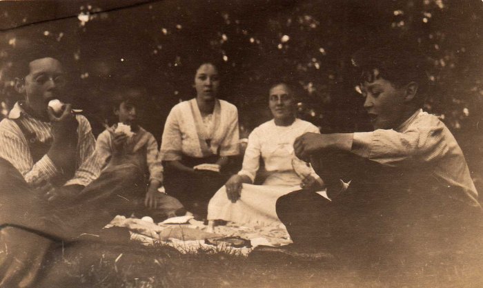This image is of Velma Mayville (center) with unknowns.