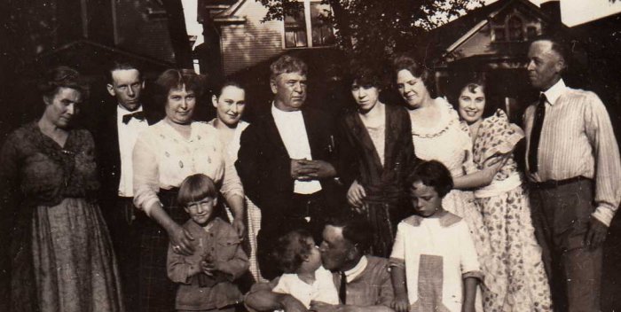 This image is of Velma Mayville (standing fourth from right) with unknowns.
