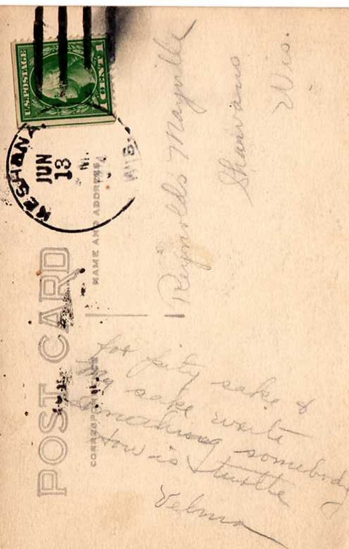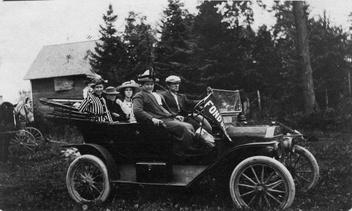 The top image is of Velma Mayville (center) with unknowns going on a trip - banner on car says "Fond du Lac." The bottom image is of what Velma wrote on the back to Reynolds.