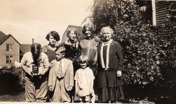 This image is of, back row: Estelle Tice, Jo Hangar, Blanche Tice and Mary E. Bingen Tice; front is Dick, James and Ruth Mechler.