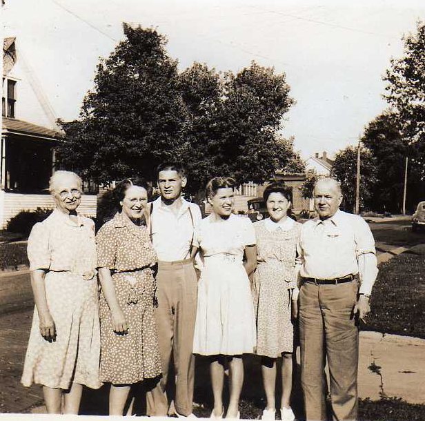 This image is of Mary Bingen Tice, Estelle Tice, unknown Mechler, Margy, Ruth and Ed Mechler.