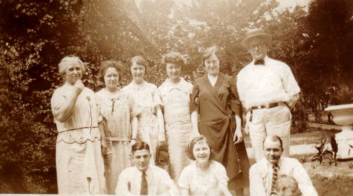 This image is of, standing: Mary Bingen, Estelle, Blanche, Francis, Monica, Frank Sr. Tice; seated Andy Feess, Louise Tice and Ed Mechler, with unknown children.