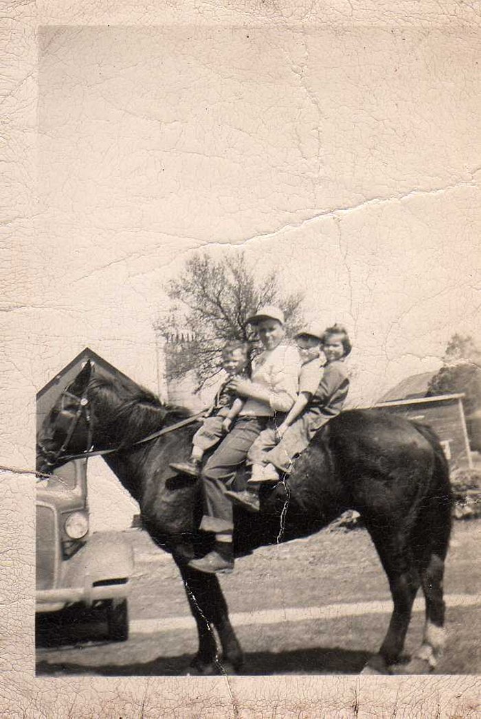 This image is of Bill Diebold with unknown kids on the horse, Babe.