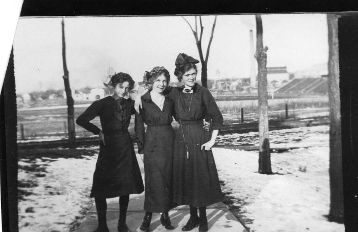 This image is of Veronica Diebold and friends. This was taken from the house on Breese Terrace and in the background you can see Camp Randall. Ca. 1915.