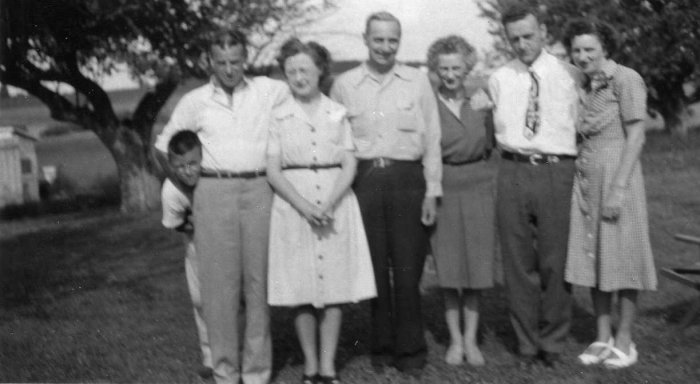 This image is of Bill, Sylvester, and Blanche Diebold, Scotty and Ferne Skidmore, and Ivan and Catherine Gutzmer.