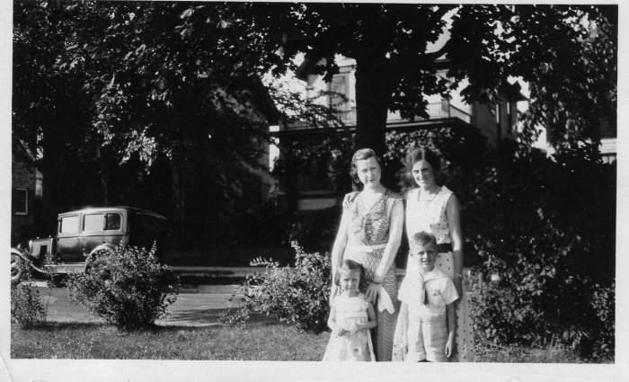 This image is of Blanche Diebold next to Elizabeth Schmitz, and their children Mary Alice Diebold and Mickey Schmitz.