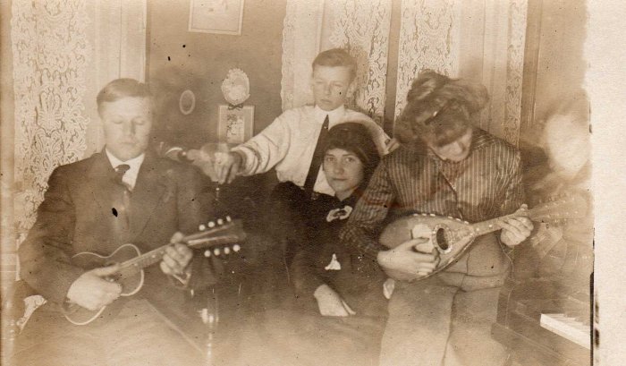 This image is of Sylvester Diebold, center/back, with a group of traveling musicians. This is in the parlour of the house on Breese Terrace.