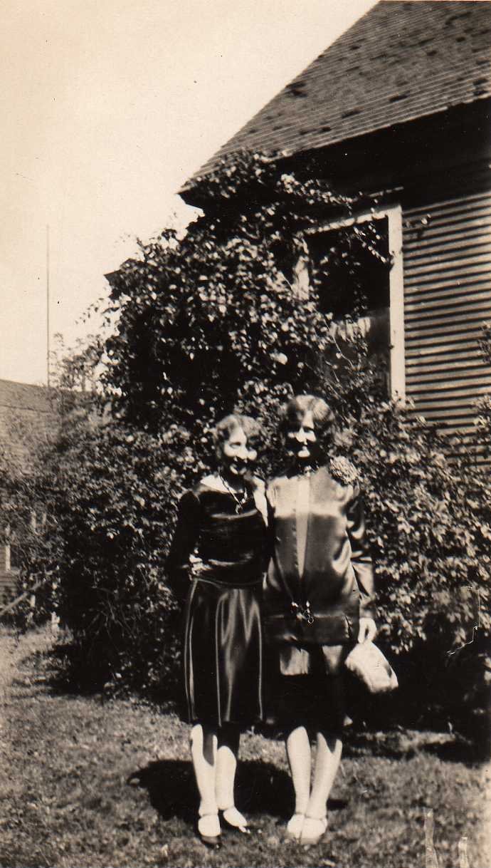 This image is of Jo Hangar (left) and Blanche Tice, on Blanche's wedding day, again on the side of the Tice home in Marshfield.