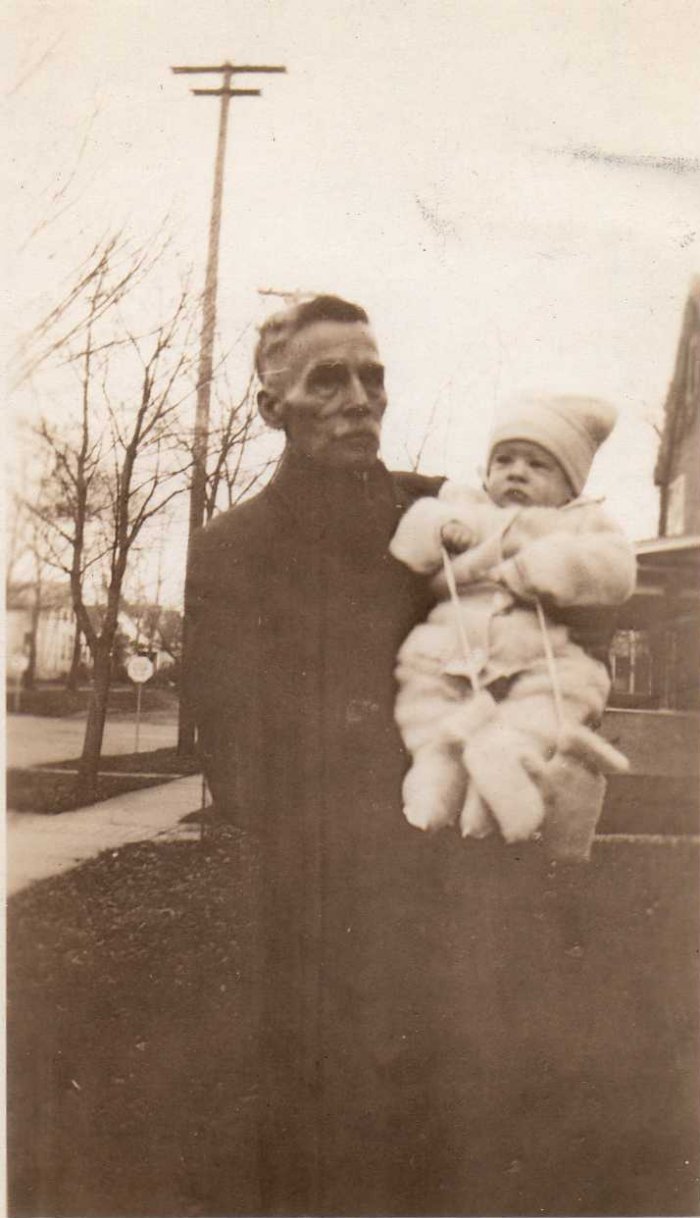 This image is of Hiram Greeley holding Mervin Farmer in 1927.