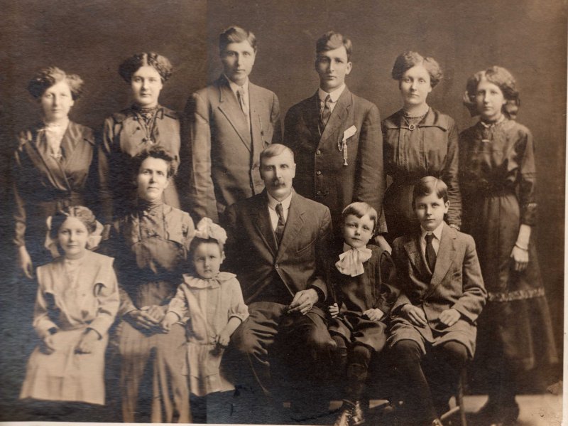 This image is of the Hartung family. In the back row: Matilda, Rose, Bernard, Leonard, Catherine, and Margaret. In the front row: Irene, Helena Timmerman, Hildegarde, Joseph, Clarence "Bud", and Edward.