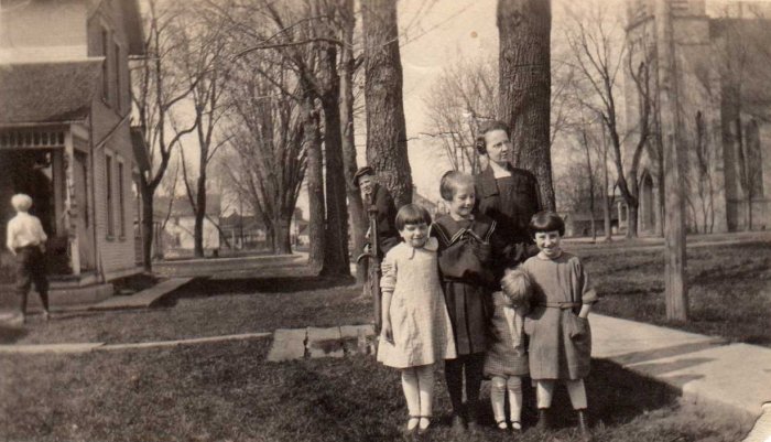 This image is: Catherine Diebold in the light colored dress, and the taller woman is Ella Hurst. Other unknown, but Hurst cousins.