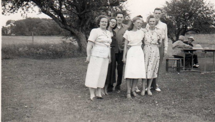 This image is of Joan & Sheila Hurst; Jimmy Diebold, Dorothy Hurst with Catherine Diebold behind her; Fern; Bob Larkin. Seated are Betty Hurst and her husband.