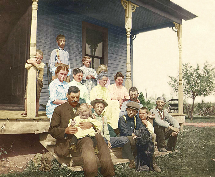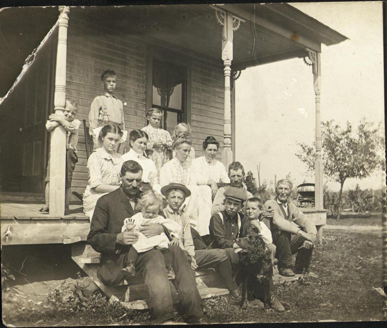This image is of: man in the front left is William Henry Huycke (m. Rebecca Mayville). The old man on the far right is Henry Powers Abel Huycke, and on the step behind him is Truman Huycke. Behind Truman is Ann Nancy Huycke Jennings. Others are unknown. This picture is courtesy of Jason Huycke.
