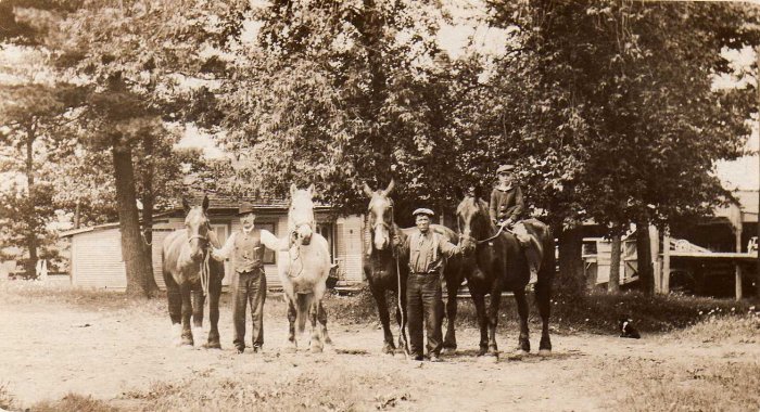This image is of cousin Charles Ninmann, Collin and Reynolds Mayville. The horses are identified as Bell, Dude, Billey and Tiger.