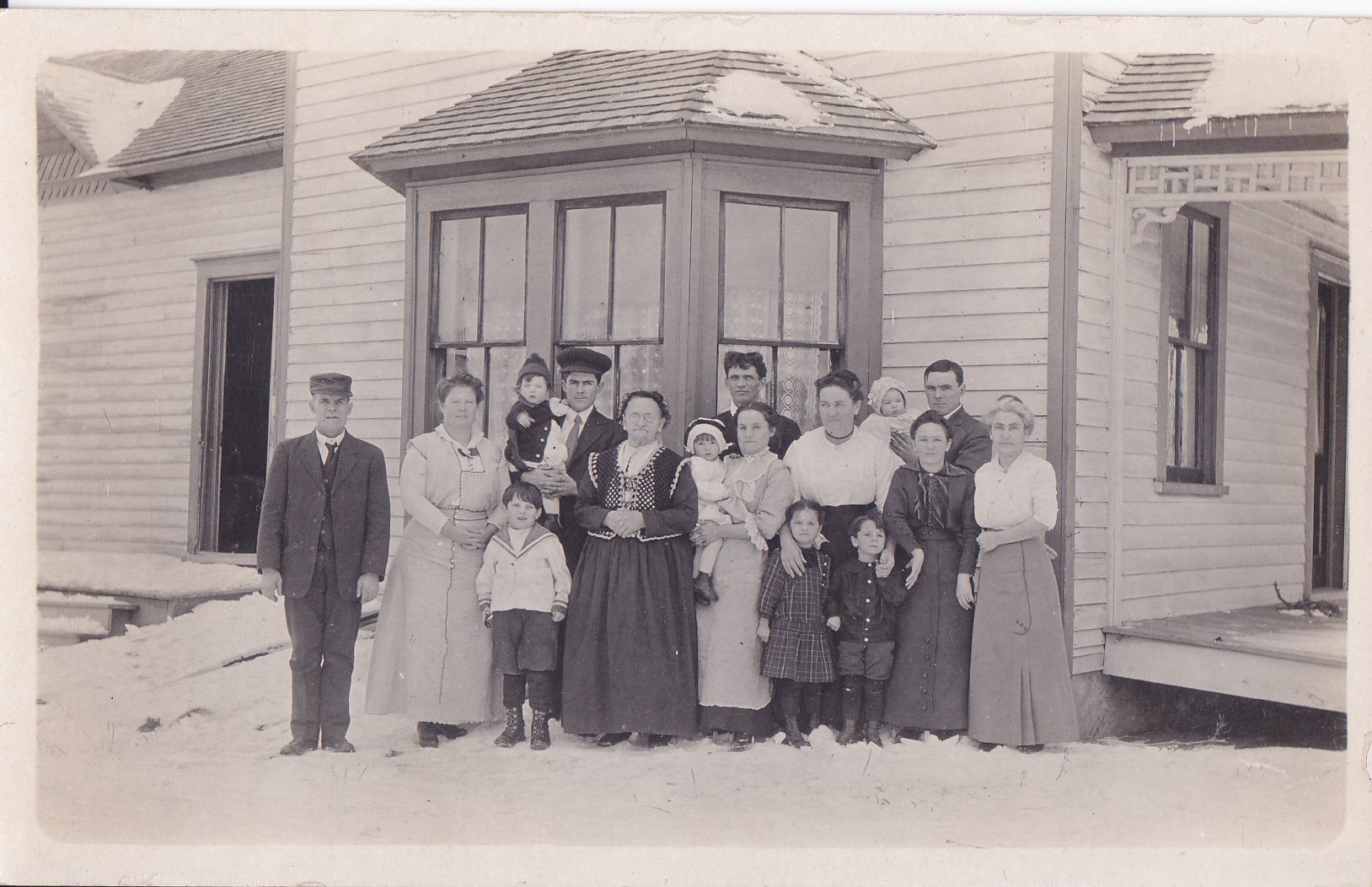 (close ups below description) This image has been identified by Ned Braatz as follows: "Thomas Peep is on the left, the older lady in the middle is Eliza Preston, to the right of her is my grandmother, Maude [Peep] Braatz, her husband Fred is right behind her. She is holding Arlene Braatz, who died as a small child. To her right is Mary Jane [Preston] Peep, and in front of her is Mildred Braatz and her brother, my Dad, Percy Braatz. To the right of her is Myrta [Bidwell] Peep with Edgar Peep behind, holding Leland (Percy), their boy. To the right of her is her mother, with the last name of Bedwell [Mary Ann Williams]. I am not sure of the couple to the right of Tom Peep with the two children. My mother thinks they are a Preston family, but she is not sure who they are. The picture was taken outside the family farm house that was a farm for Issac Peep, then run by Tom Peep, then Edgar Peep." Thomas Peep was the son of Deideamia Mayville.