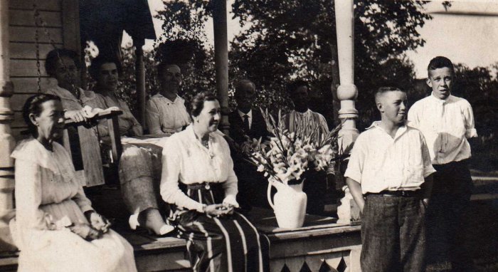 This image is of: seated in front, Isabel Greeley & unknown DeLong; seated on the swing, Gertie Mack, Eula Mack and Clorie Greeley Mayville; standing, Joe Buffum, Collin Mayville, Lafayette Thompson, and Reynolds Mayville. This is on the porch of the Mayville house on S. Franklin St. in Shawano. | |