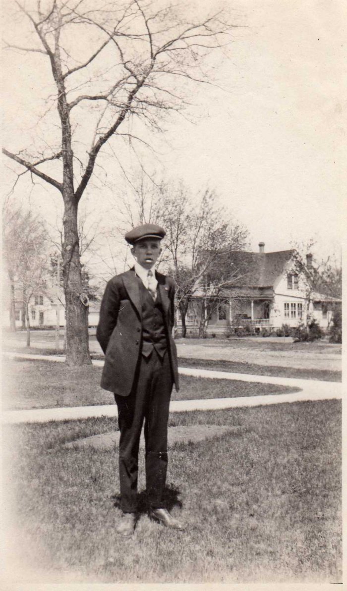 This image is of Reynolds Mayville standing on the front lawn of the Mayville house on S. Franklin St. in Shawano.