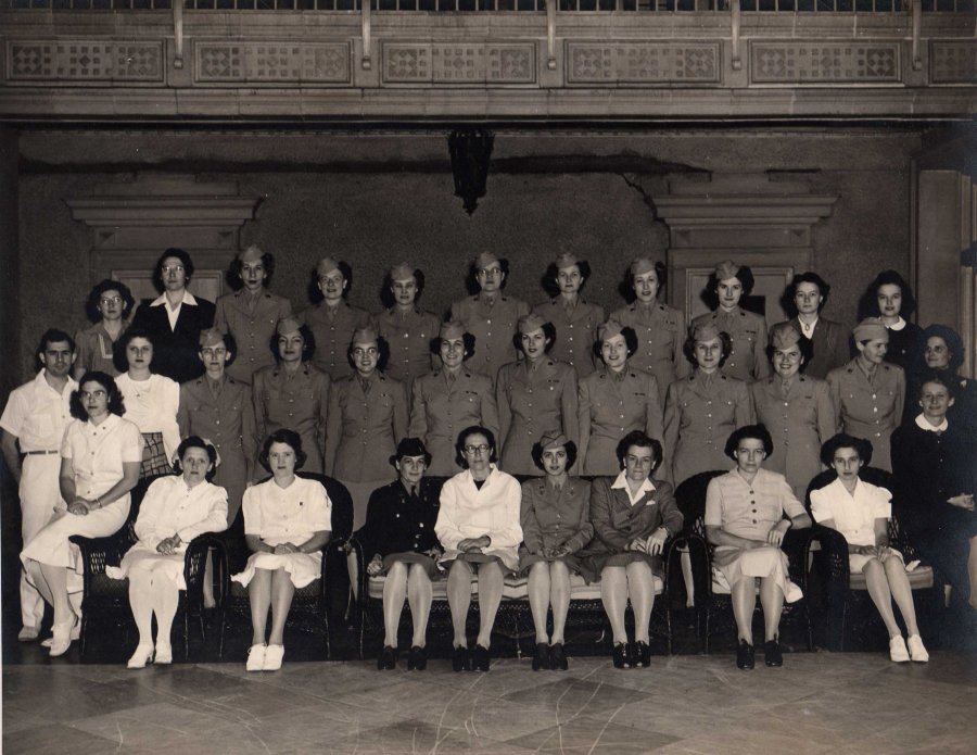This image is of 44th General Hospital Unit at Wisconsin General in Madison, WI. It was labeled on the back by Blanche Tice as follows: 1st3rd row, L to R: J. Blue, R. Burdon, F. Streyes, Lt. Warren, Doc Hellenbrandt, Lt. Surfey, M. Kahli, M. Mills, S. Hirt, M. Morten. 2nd Row: P. Parisi, B. Blackman, Pfc. Burgett, Stf Sgt. Pietr, Pfc. Woods, T/S Gruber, Cpl Davis, Pfc. Ogle, Pfc. Ryssy, Pfc. Holcomb, Pfc. Skinner, C.Fries. 3rd Row: S. Schumacher, A. Christian, Pfc. Grandeman, Pfc. Rankin, Pfc. Tanner, Pfc. Newill, Pfc. Wallace, Pfc. Gray, Cpl. Hall, Ann Parrish, E. Bradley. | |