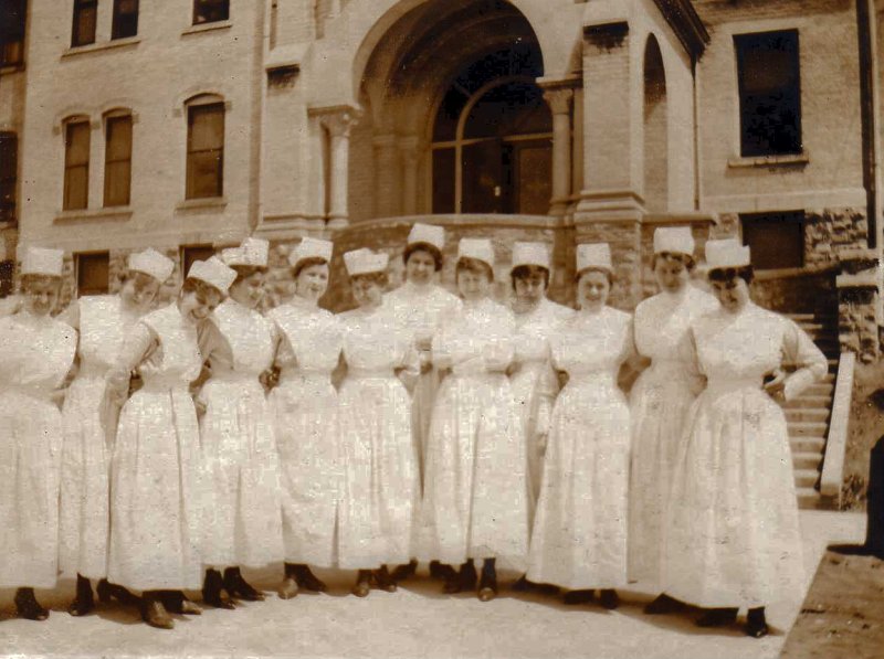 This image is of Blanche Tice and fellow nurses in Marshfield. She is fifth from the right.