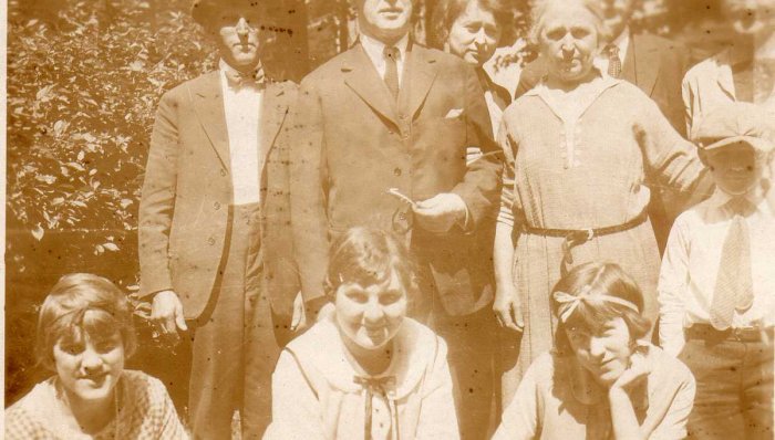 This image is of Unknown, Frank Tice, Francis Tice, Mary Bingen Tice, and the rest are unknown except bottom right is Mary Tice Schmid.